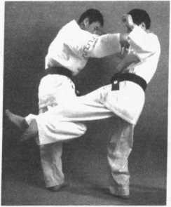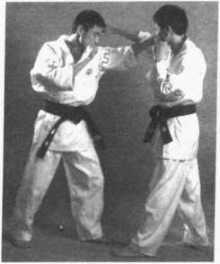 对手右直拳击攻击我头部,我向左躲闪,身体向右侧身躲开来拳,以左腿用 脚跟向后绊对手右脚,使对手向前扑倒。(图2-133、图2-134)