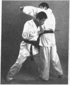对手用拳攻击我头部时,我下潜,向前上步,左脚落在对方两腿之间,屈 膝,双手抱对手腰部后勒,身体前倾,挤压对手、右腿从外边向后勾其左小腿, 将其向后摔倒。(图2-138、图2-139)