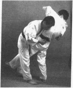 当对手用右腿攻击我胸部时,我迅速两手抓抱对手右小腿或脚踝处;身体左 后转,两膝屈蹲,将对手右腿扛抬于右肩上;低头、弓腰,两腿猛蹬,两手下 拉,将对手过背摔倒。(图2-130、图2-131、图2-132)