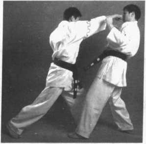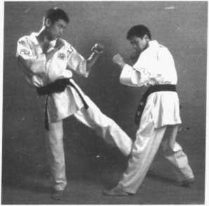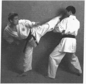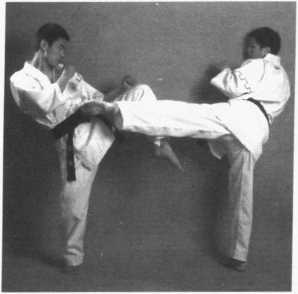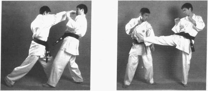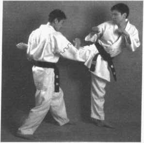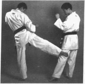 4 .右侧弹踢腿——提膝防左侧弹——左横踢腿踢头(图2 - 334、图2-335、 图 2 - 336)