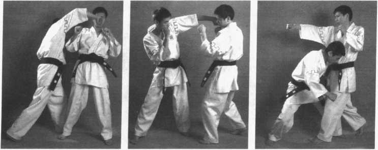 1 .右直拳击头——里挂右蹬腿——右摆拳击头(图2 - 326、图2 - 327、图2 -328)