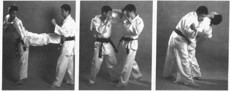 3 .左侧弹踢腿——抄抱右侧弹腿——右直拳击头(图2-331、图2- 332、 图 2-333)
