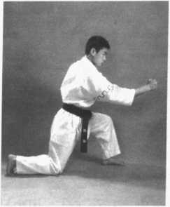 变马步成右跪步,左虎爪收至右肩上方,右虎爪变立拳向前击打,目视前 方。(图8)