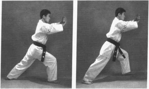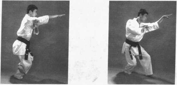 向外,向左下方出拳,右拳变掌置于胸前,目视左下方。(图18、图19正面)