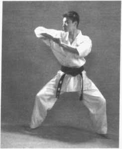 弓步顶肘,上体向右转90度,变弓步成马步,左拳变左掌,向右侧推至右