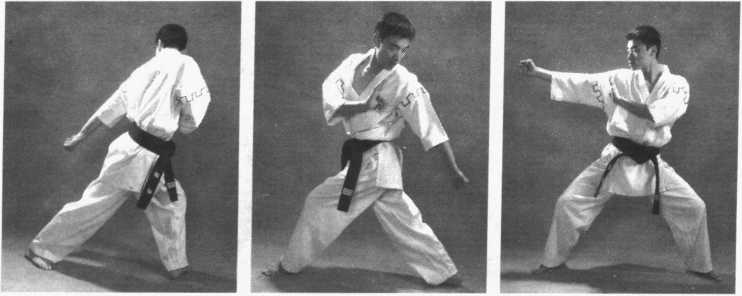 右腿从左腿后方向左上一大步成偷步。左拳由内朝外翻转,拳眼向下,拳心