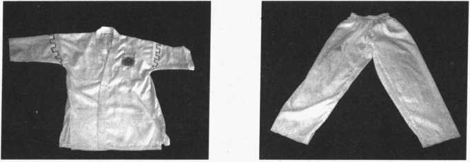 面料为白色涤棉交织的细帆布,表演服还有蓝、红、黑三种颜色。道袍款式 由少林武僧上衣的基础改进而成,肩上有长城图案,热爱和平民族的象征;背部 或上臂部有“虎、狼、豹、大象、拳头、龙、骷髅、狐狸、鹰、五角星”等各种 绣花图案可供选择装饰,道裤大致与跆拳道的一样。少儿族(12岁以下)道袍 的领口有宽1.5厘米的蓝色装饰条。(图1-1、图1-2)