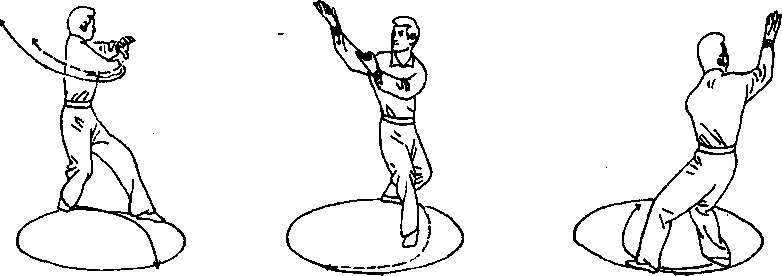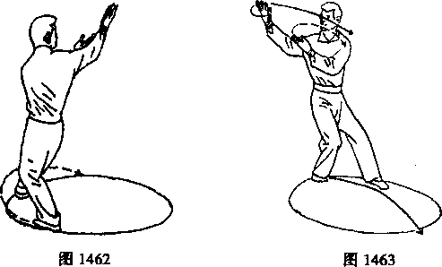 上动不停,弓右膝重心前移。向右脚前扣上左步(第四步)。再向右后扭腰。双臂 再向右后方上伸后摆。重心极力下坐于右腿。眼看右掌。共摆扣四步,原地转一小圆 圈。呈青龙飞天式(如图1463)。