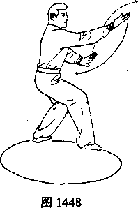 (2)右反劈掌:向前进右步,微跟左步,同时左手变俯掌搂回腹前,右手变仰掌 由左手背向前上方反掌劈出(如图1448)。