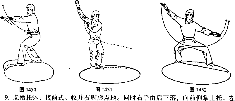 上动不停。向前进右步,微跟左步,同时双手翻掌向前下推按,重心坐于左腿, 眼看双掌前呈老僧托钵式(如图(1454)。