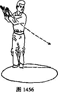 15 .鸿雁出群:上动不停。弓左膝重心前移。同时左手向前推按。向右前方摆上右 步(第一步)。向右扭腰。同时右手由左臂下向右前上方旋掌摆出。左手落于右肘弯 处。两手心均向里。眼看右掌呈鸿雁出群式(如图1460)