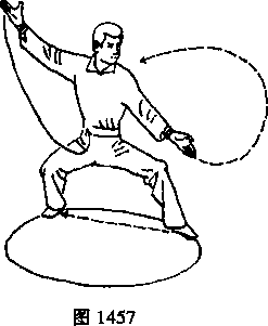 16 .青龙飞天:上动不停。弓右膝重心前移。向右脚前扣上左步(第二步)。向右 后扭腰,双臂向右后方上伸后摆。臀部极力下坐。眼看右掌(如图1461)。