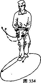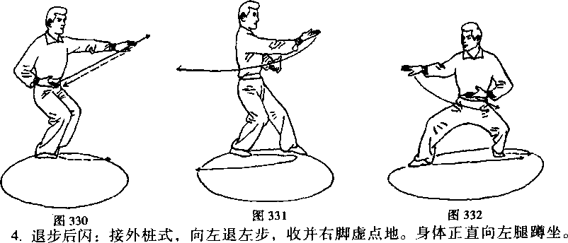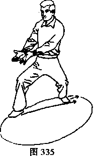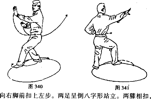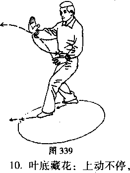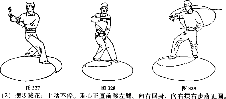 (1)扣步藏花:向右脚前扣上左步落正圈。重心正直坐于右腿。两手拧臂圆撑胸 前抱球。右手在上,高与胸齐,手心向下;左手在下,手心向上。指尖向右,眼看右 手。呈扣步藏花式(如图328)。