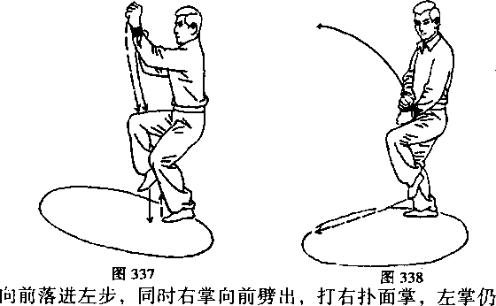 上动不停,向前进左步,微跟右步,同时左掌向前立掌劈出,右掌收回腹前。重 心仍坐于右腿,呈进步左扑面掌(如图340)。