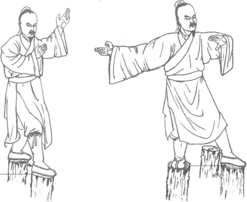 左脚再向前,右脚随之前跟,如 此循环练习。若右脚在前,左脚在后 成定势时,则姿势相反。