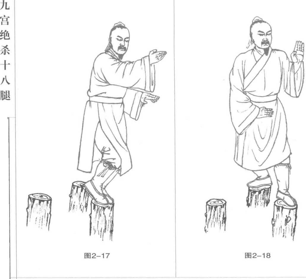 2.重心前移于左腿之上,右脚随 之前移踮于左脚跟内侧。同时,左掌 向前、向左弧形撩抓,右手随之由后 向前弧形甩打。(图2-17)