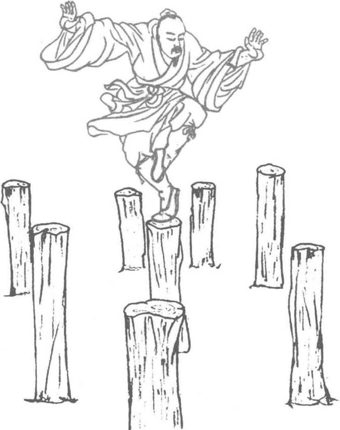 以九宫图为参照,按照一定的环 行距离分别埋上高约3米、直径约15 厘米的木桩,此即“九宫桩”。然后按 顺逆路线在桩内绕转穿行,变换姿 势,称之为“穿花绕树”,或称“九宫 步”,或称“九宫飞星法”等等。