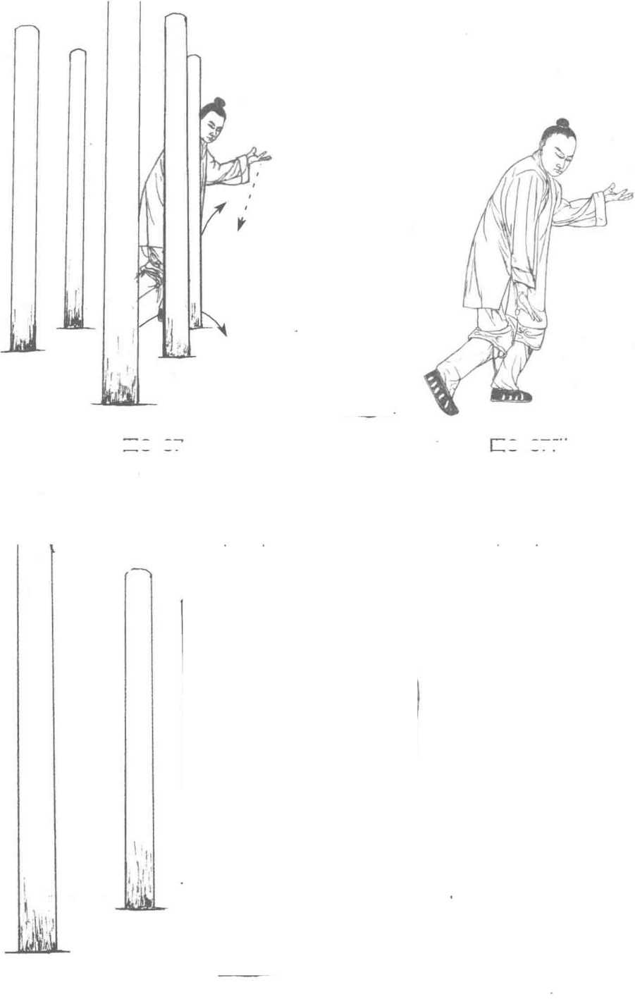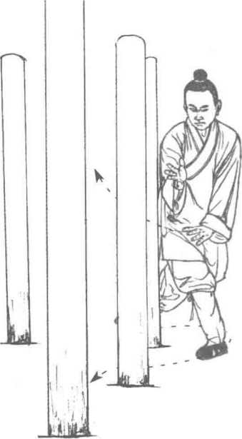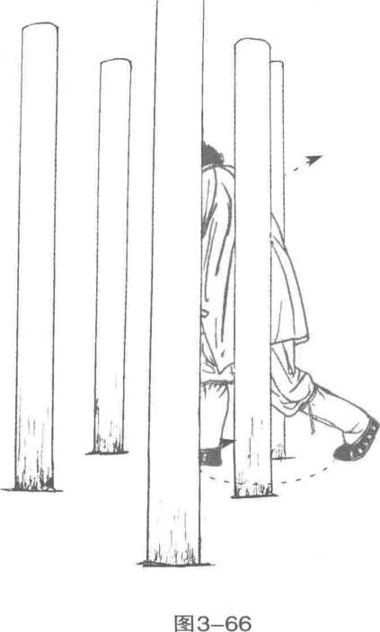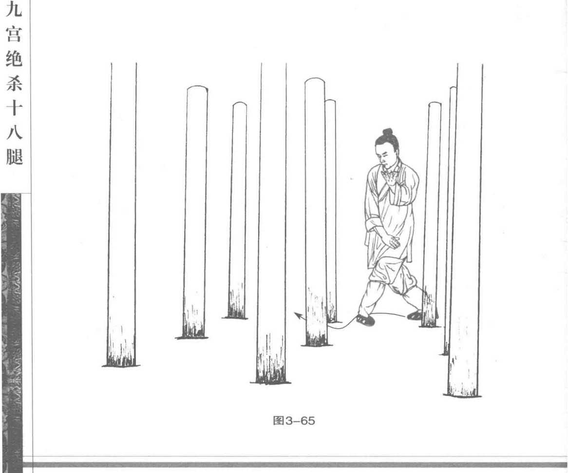 1. 左脚经右脚内侧向前(西面) 上步,脚尖外展,成扭步。同时,右掌 下按,置于左小腹角前侧,掌尖向 左;左掌向左斜前侧屈肘上托,高与 肩平,虎口向后。目视左脚前下。 (图 3—65)2. 九宫步沿六桩逆转三步,至六 桩的东面。(图3-66?图3-68)第三章穿花绕树九宫飞星桩一图3—66附图 3—67图 3—68图3—67附