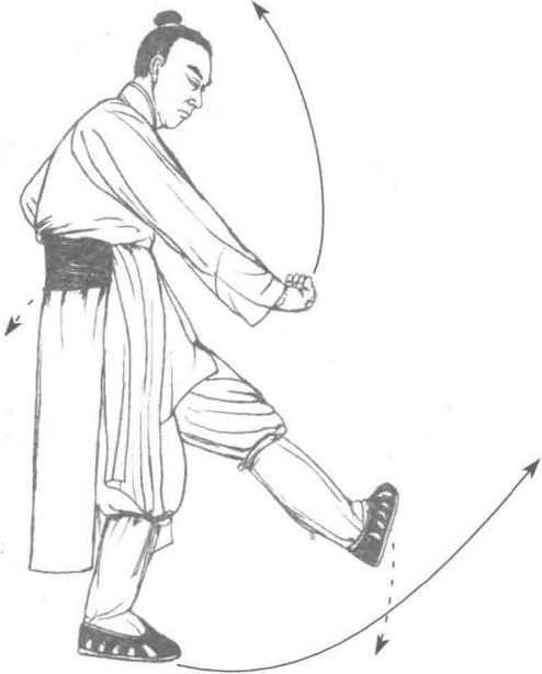 后拉左拌腿左脚提起,勾脚尖外展,从后向前拌击,高不过膝;右腿...