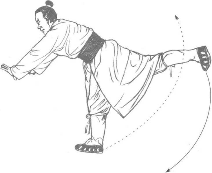 一、右后蹬腿左脚落步,脚尖内扣,体右转约 90。;右腿由屈到伸,脚尖勾起用脚跟 猛力向后蹬出,高与腰平。同时,两臂 前合微撑圆,两掌心向下。目视前下 方。(图4-43)一、右后蹬腿左脚落步,脚尖内扣,体右转约 90。;右腿由屈到伸,脚尖勾起用脚跟 猛力向后蹬出,高与腰平。同时,两臂 前合微撑圆,两掌心向下。目视前下 方。(图4-43)图 4一43图 4一43|九宫绝杀十八腿经典珍藏版
