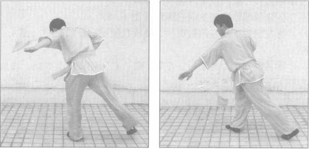 左腿向左后弧形拨扫,拨扫与上摆右小腿要前后协调进行。