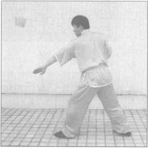 翻身抡鞭时,要抬头、挺胸、展髓,打开左臂;翻身后要迅