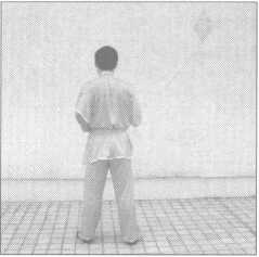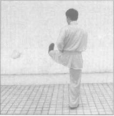 ②鞭继续经上向右绕动,左腿前伸,使鞭缠压于左小腿下; 左手顺势收于腰间抱拳(图4 - 86)。