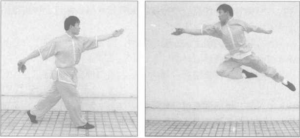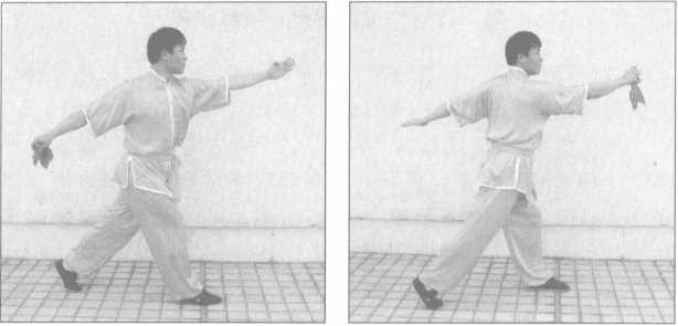 ①左、右脚依次落地,两臂自然下落(图5-17)。②左脚向前上步,右臂稍后摆(图5-18)。③迅速上右步,保持重心;同时两臂后摆(图5-19)。?④上动不停,右脚随即蹬地跳起右转身,右腿屈膝,左腿伸 直;同时鞭向前上方放出,目视前上方(图5-20)。图 5-17 图 5-18图 5-19 图 5-20【要点】在空中左腿要尽量抬平,右腿要屈膝收紧。