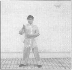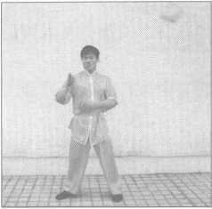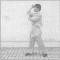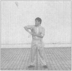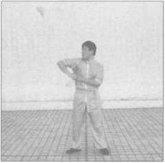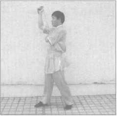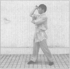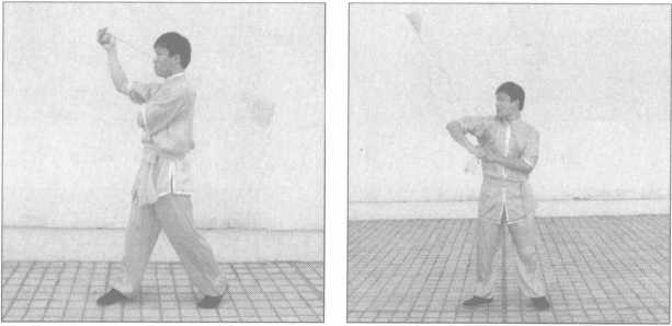 ①右、左腿依次落地,鞭由前下绕至体后下方时,小臂屈肘 内收,肘关节向外伸出,使鞭搭在大臂后下侧,然后,鞭再继续 绕至体后上方(图5-21)。