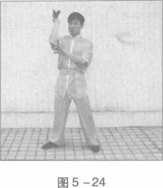 ②右肘自右经前上向左弧形绕动,同时鞭头自右向上方经前 绕至右前下方;身体右转90度(图5-22)。
