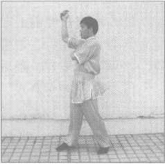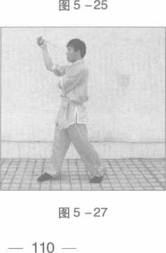 ⑥右肘自右经前上向左弧形绕动,同时鞭头自右向上方经前 绕至右前下方(图5-26)。