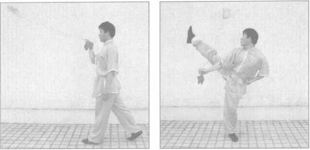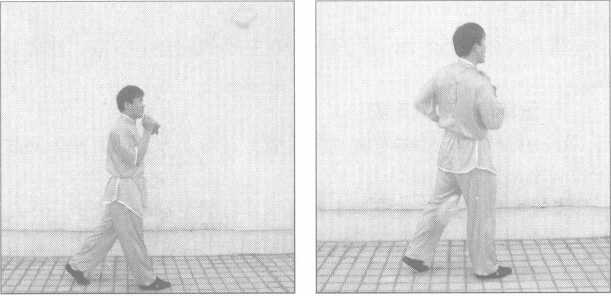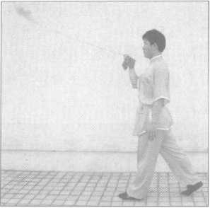 ③右腿向左平摆约35度,使鞭由后向上经腿外侧绕至前方 (图5-46)。