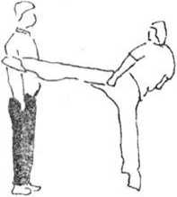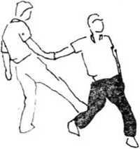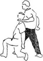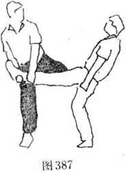 (1)则甲的攻击动作右脚稍向左撤步身体随之稍右转以双臂(或手)截抱击来腿屈抬左腿下压乙左腿膝关节(图386—387),随其后倒再以右脚踩踏其裆部(图388)。