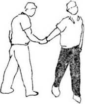 当甲右手抓握乙的右手腕时迅速沉肘上挑由下而上反翻拧甲右手腕(图381-382),提抬右脚狠踩踏甲右腿膝窝同时右手回拉甲右手腕使其上体后仰下体前屈地右脚随后前落地左手腕握甲下颌翻拧其颈同时右手后拉甲右腕(图383—384)。