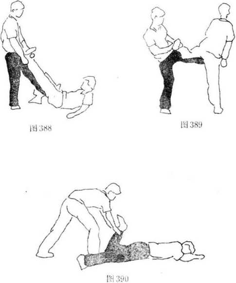 当甲以腿下压时则上屈左腿双手迅速抓握甲脚踝关节(图389),向左侧拧转使甲向前仆倒随之双手狠力向前下推按甲左踝关节(图390),再以双脚夹紧其脚左手上拉甲左手腕右尹向下掐压其后颈处(图391)
