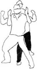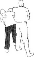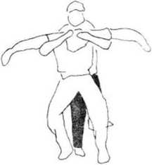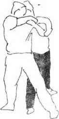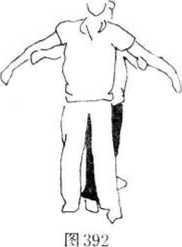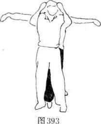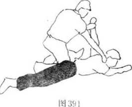 6 (图392—394)所示甲在乙背后以双臂从乙腋穿过,上挑乙肩卜按压乙头部。在这样情况下乙的攻击动作当甲双臂穿过腋下即将屈肘举臂时忙双臂下沉压甲双臂(图395)拧腰左转体以右擒拿甲左手腕(图396),右
