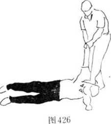 (2)乙的反击动作当甲上右脚要别腿时忙将右腿后抽(图422),落地后再迅速上前并屈腿下蹲右臂自甲双腿间穿过(图423—424),以肩臂上扛甲裆部左手前下拉甲左腕,蹬直双腿将甲扛、掀、摔倒于地双手上拉甲右腕以脚踩踏甲头部或颈部(图425—426)。