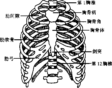 胸部的骨性支架是胸廓胸廓由1块胸骨、12块胸椎和12对肋及肋软骨构成相邻两肋骨、肋软骨之间的间隙称肋间隙(图3-30)0