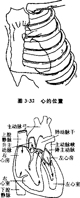 心位于胸腔之内13在身体正中面右侧,23在左侧。前方对向胸骨体和第2?6肋软骨后方平对第5-8胸椎(图3-32),,