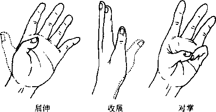 拇指的运动多为腕掌关节、掌指关节和指间关节的联合运动可屈45?90°,伸30?70°,收展30?65°(图3-74)。