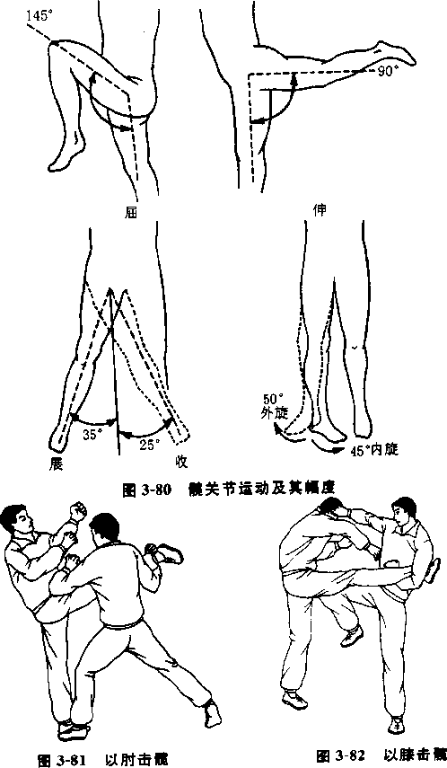 可作3个轴的运动前屈可达145°,后伸可达9。°,内收25°,外展35°,内旋45°,外旋50°(图3-80)。