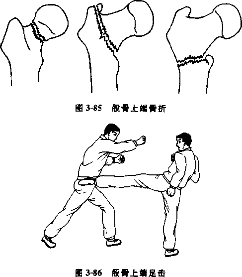 较坚实但由于它具有比较长的打击跨度所以常被选作打击部位。一个训练有素的格斗手其足击力量可以达到500?600,重创之下可致股骨干骨折。根据打击部位不同可分为股骨干上13骨折、中13骨折和下13骨折(图3-87)0其中股骨干下13骨折骨折断端在暴力作用下后移,可损伤与之密切毗邻的股动脉伴发出血。