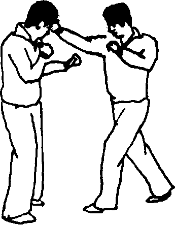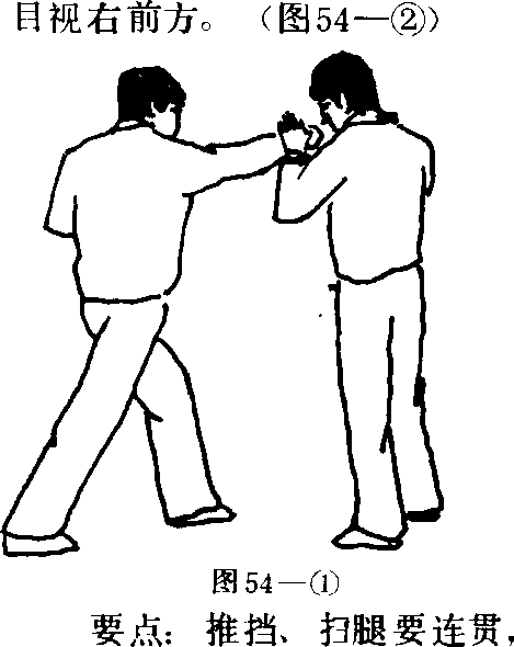 敌以右直拳向我面部击打时我右脚稍向后撤步左脚随之后撤,左拳变掌向右推击敌右小臂外侧(图54—1)