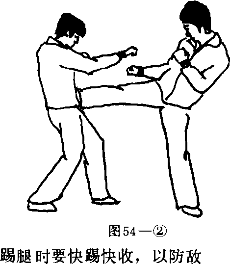 要点此为败退反击的方法。攻击时要看准敌方向回收拳的空当发腿借敌方前冲之力攻击效果更佳。要快踹快收,