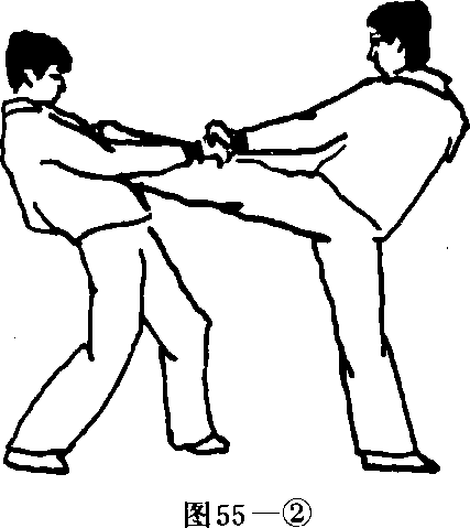 同时向右侧转体左脚向左侧踹击敌胸部。(图55一2)