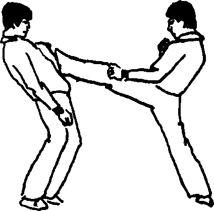 随左脚向后撤步的同时左腿提膝左脚向前方猛力踹击敌上腹部。着力点于前脚掌攻击敌黑虎偷心穴或水分穴(图56—)