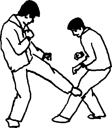 在左脚向后撤步的同时提左膝脚尖向右脚掌内扣,左脚向左侧猛铲击敌左膝关节外侧阳陵泉穴迫敌向后撤步。(图57-)