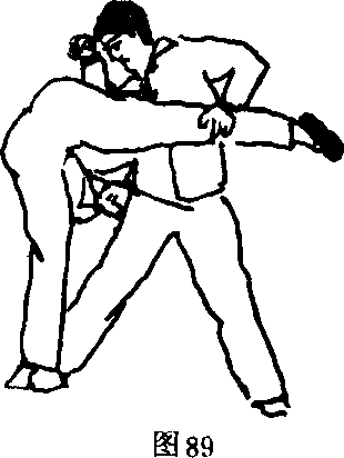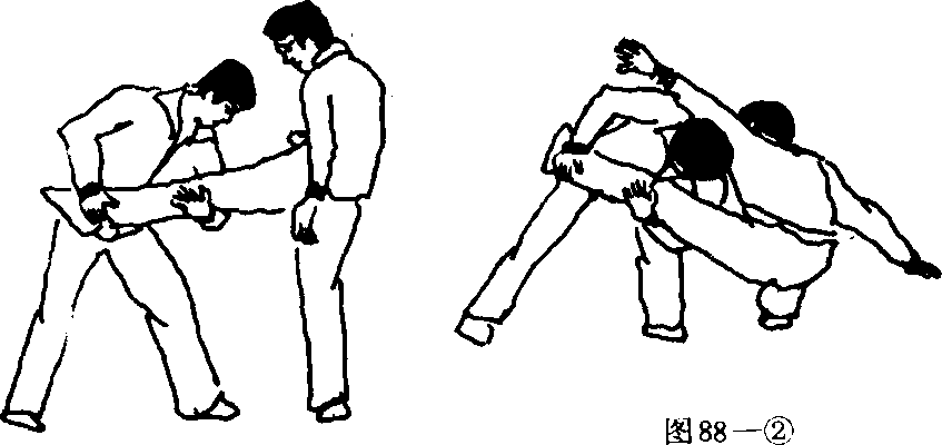 向右后敌右腿将敌摔倒。图88—2)