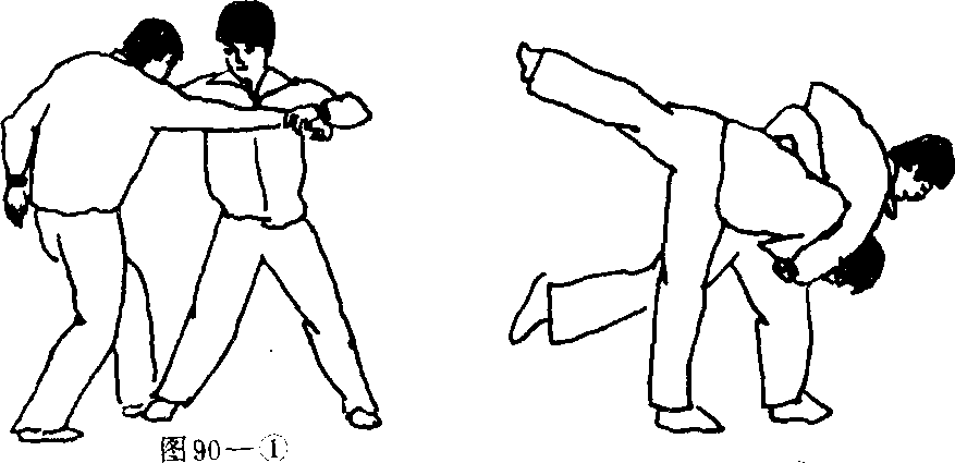 右臂由敌脑后挟住敌颈部左手用力拉紧敌右臂猛向左后转体以臂部猛力撞击敌小腹右腿向后上方挑起向左后俯身变脸的同时将敌摔倒。(图90—2)