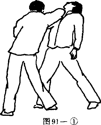 顺势向左后刁抓敌右腕并向左后方掳带(图90—1)